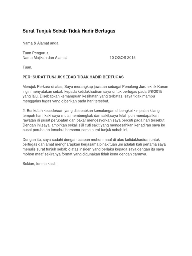 Contoh surat tunjuk sebab tidak hadir bertugas pdf document.